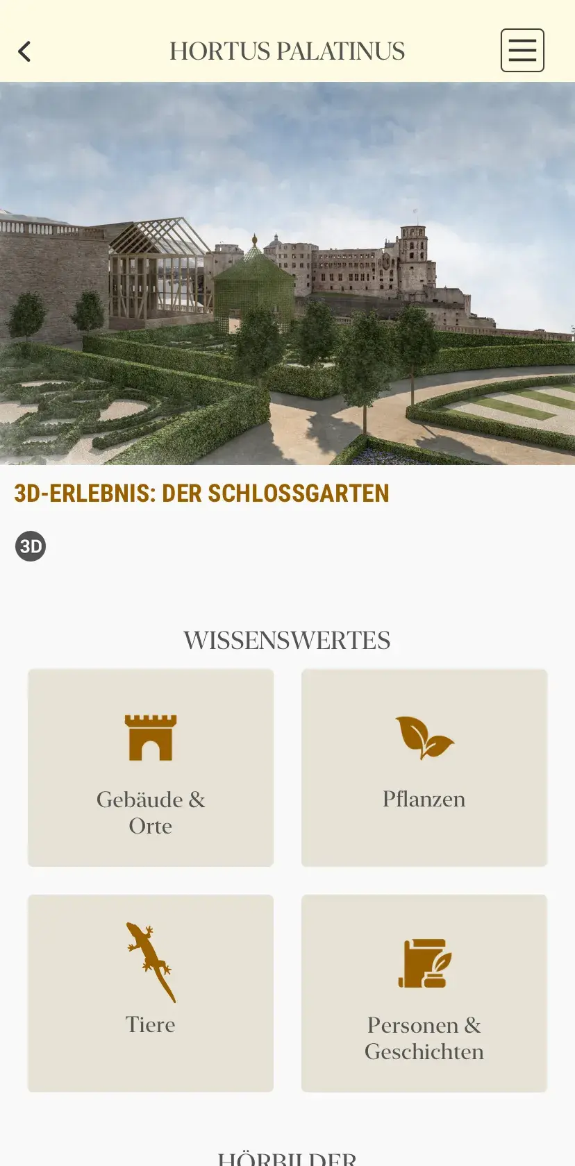 In der Anwendung stehen zwei Modi zur Auswahl: Der geführte Modus mit Haltepunkten entlang der vorgeschlagenen Route oder der sogenannte „Explorer Modus“. Bei letzterem können die Nutzerinnen und Nutzer aus vier Wissensgebieten „Gebäude & Orte“, „Geschichte & Personen“, „Flora“ und „Fauna“ ihre eigene Führung zusammenstellen. Die virtuellen Touren basieren auf einem georeferenzierten Raummodell, das die Besucherinnen und Besucher über die Satellitenortung ihres Smartphones am Standort lokalisiert. Dadurch wird die Modellansicht entsprechend des Standorts der Gäste visualisiert und verwandelt das Modell in einen interaktiven Erlebnisraum. Ähnlich einem Videospiel erkunden die Nutzer den virtuellen Garten aus ihrer eigenen Perspektive, ohne Avatar, sondern direkt im Modell agierend. Zusätzlich bietet die App interaktive Teilmodelle und spielerische Inhalte wie ein Wimmelbild als Hörspiel-Modul.